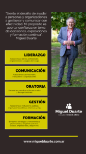 “Siento el desafío de ayudar a personas y organizaciones a gestionar y comunicar con efectividad. Mi propósito es aportar confianza en toma de decisiones, exposiciones y formación continua”. Miguel Duarte